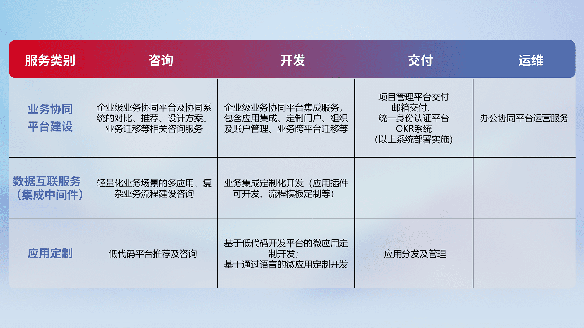 针对钉钉、、、、企微、、、、IDaas等平台级产品提供产品的规划、、方案、、交付、、、定制化开发等服务,,实现如统一协同办公、、、智能客户服务、、混合会议管理、、智能数据查询、、等业务场景,,,实现数字化转型。。